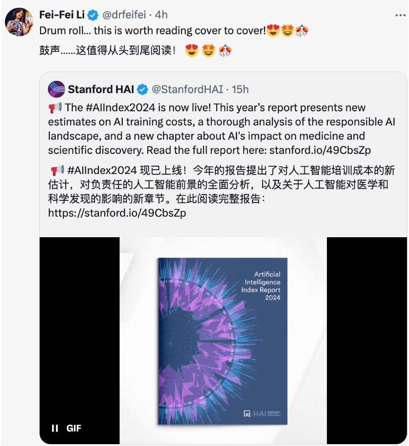 HAI是斯坦福大学成立的由李飞飞教授与哲学家John Etchemend等领导的新部门。AIIndex2024 已经是第七次年度报告,李飞飞教授在X社交平台上第一时间帮忙宣传,还是熟悉“值得从头读到尾”的建议。