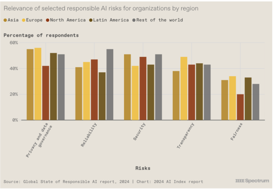 今年,AI Index 团队对全球 1000 家收入至少 5 亿美元的公司进行了调查,以了解企业如何看待负责任的 AI。结果表明,隐私和数据治理被认为是全球最大的风险,而公平性(通常在算法偏差方面讨论)仍然没有得到大多数公司的认可。报告中的另一张图表显示,企业正在针对其感知的风险采取行动:跨地区的大多数组织都实施了至少一项负责任的人工智能措施来应对相关风险。