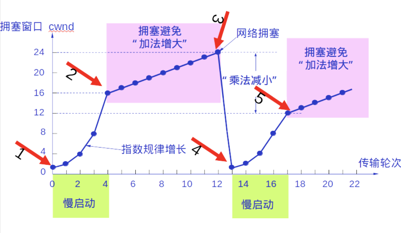 。这样拥塞窗口cwnd按线性规律缓慢增长,比慢开始算法的拥塞窗口增长速率缓慢得多。